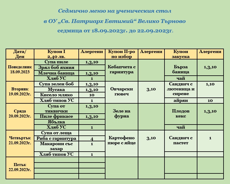 Препоръка: По-удобно за родителите, както и за организацията на столовото хранене, е закупуването на купони да става по възможност за цялата седмица.