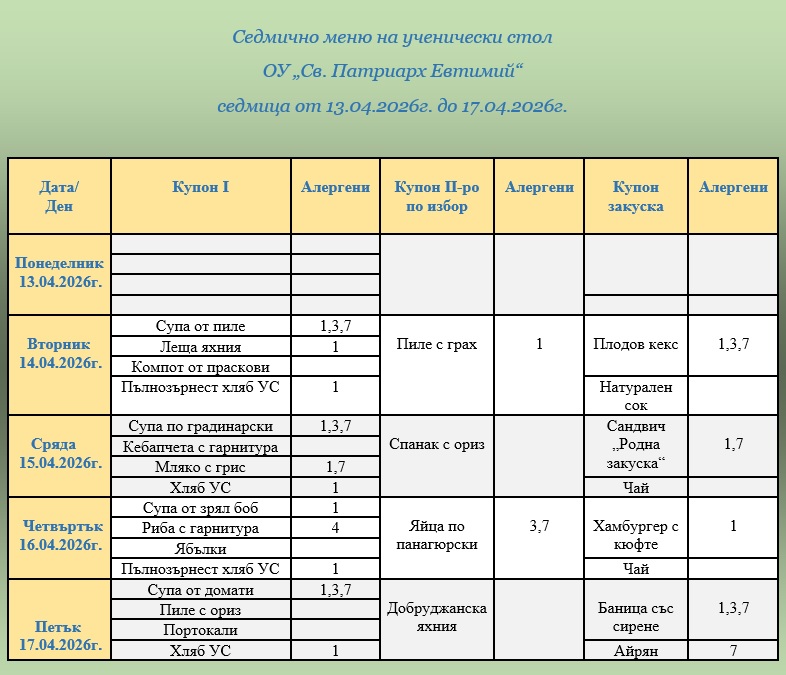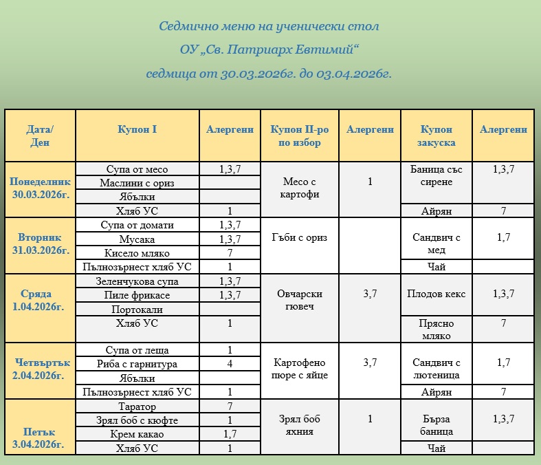 ВАЖНО: Уважаеми родители и ученици, от 1 януари 2026г. цените на купоните за училищния стол са променени. Решение № 826/27.11.2025г. на Общински съвет – Велико Търново