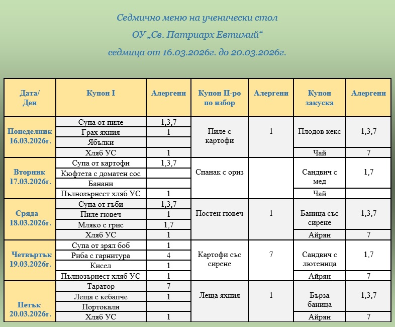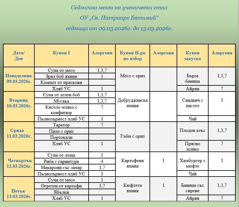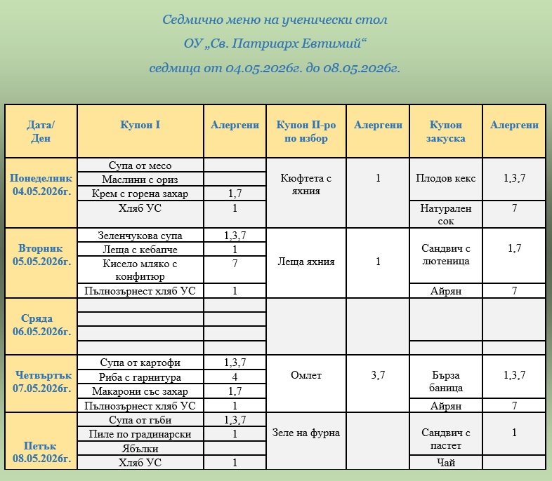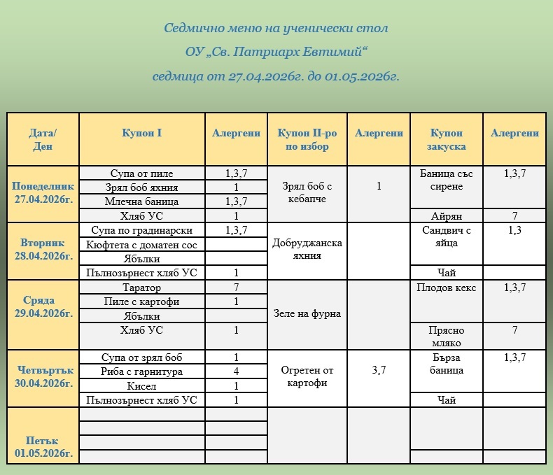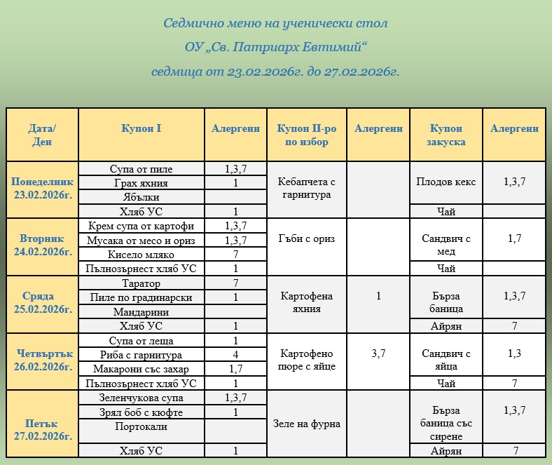 ВАЖНО: Уважаеми родители и ученици, от 1 януари 2026г. цените на купоните за училищния стол са променени. Решение № 826/27.11.2025г. на Общински съвет – Велико Търново