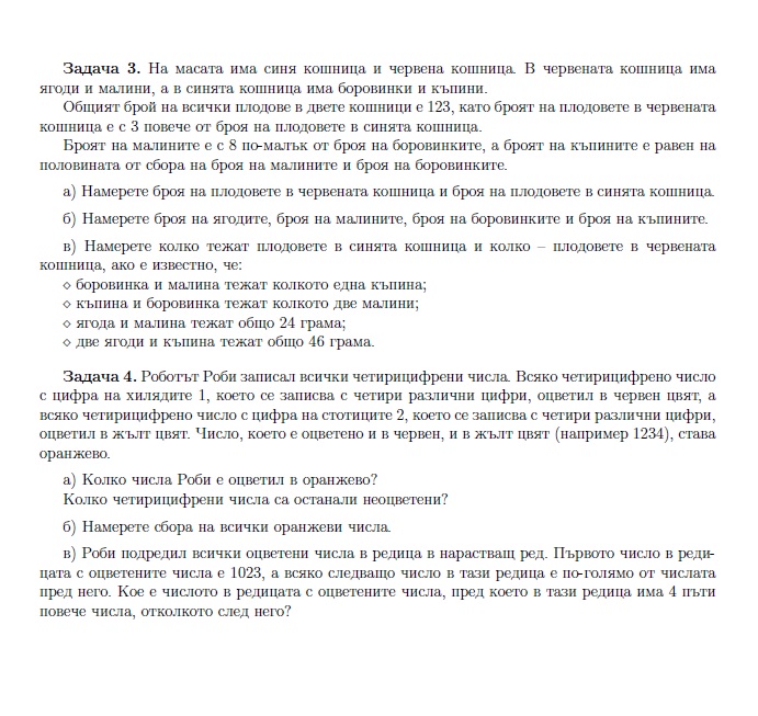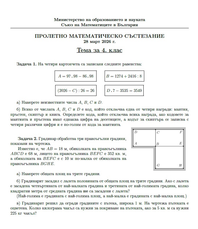 по регламент на състезанието „Пролетно математическо състезание за ученици от IV клас“, проведено на 28 март 2026г. в ОУ „Св. Патриарх Евтимий“ гр. Велико Търново, Ви представяме задачите, върху които са работили участвалите ученици: