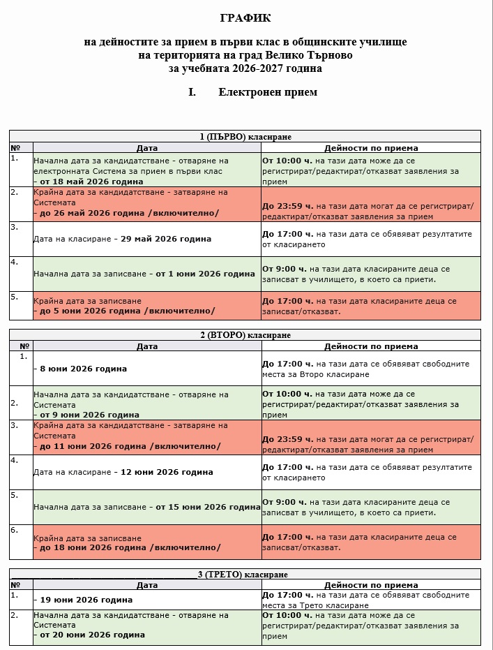 Приемът на ученици в първи клас за учебната 2026/2027 година се извършва в специализираната електронната система на Община Велико Търново