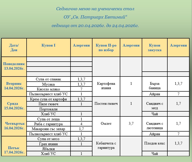 ВАЖНО: Уважаеми родители и ученици, от 1 януари 2026г. цените на купоните за училищния стол са променени. Решение № 826/27.11.2025г. на Общински съвет – Велико Търново